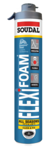 Soudal Flexi Expanding Foam is a self-expanding, highly flexible, reusable polyurethane foam for use with the Soudal Click & Fix Foam Gun. Very high elastic recovery, excellent adhesion on most substrates, very good filling capabilities, low expansion, and good compressibility.