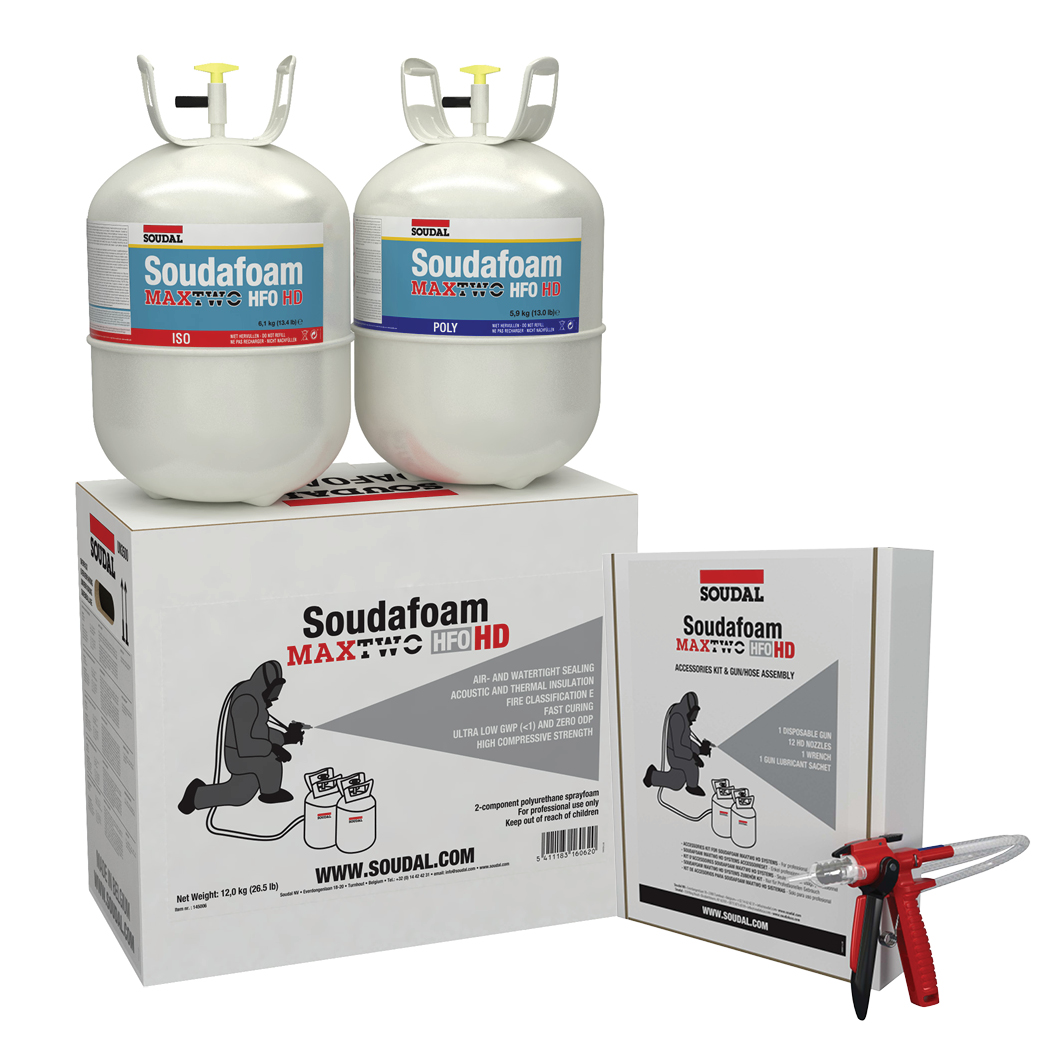 Soudafoam MAXTWO HFO HD is a high-density, 2-component polyurethane spray foam specifically developed for professional and industrial applications where greater mechanical strength and compressive resistance are required. Unlike the standard MAXTWO HFO, the HD (High Density) version delivers a tougher, more rigid foam ideal for small-area structural support, floor or roof repairs, and load-bearing insulation tasks.